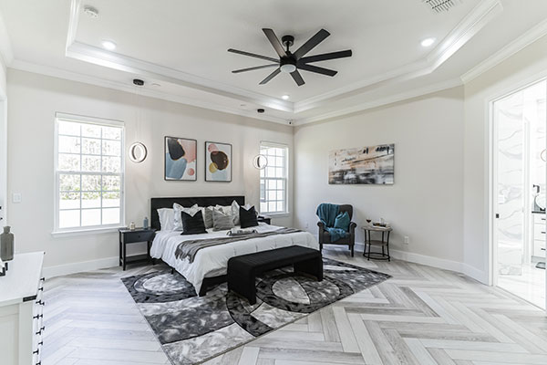 The spacious master bedroom suite features a tray ceiling with recessed lights, remote controlled fan with lights, huge walk-in closet, exterior door access to patio, luxurious tub with separate shower stall in master bath, dual sinks in vanity with granite countertops and floor tiles. This model has plenty of storage space and includes a 3 car garage.